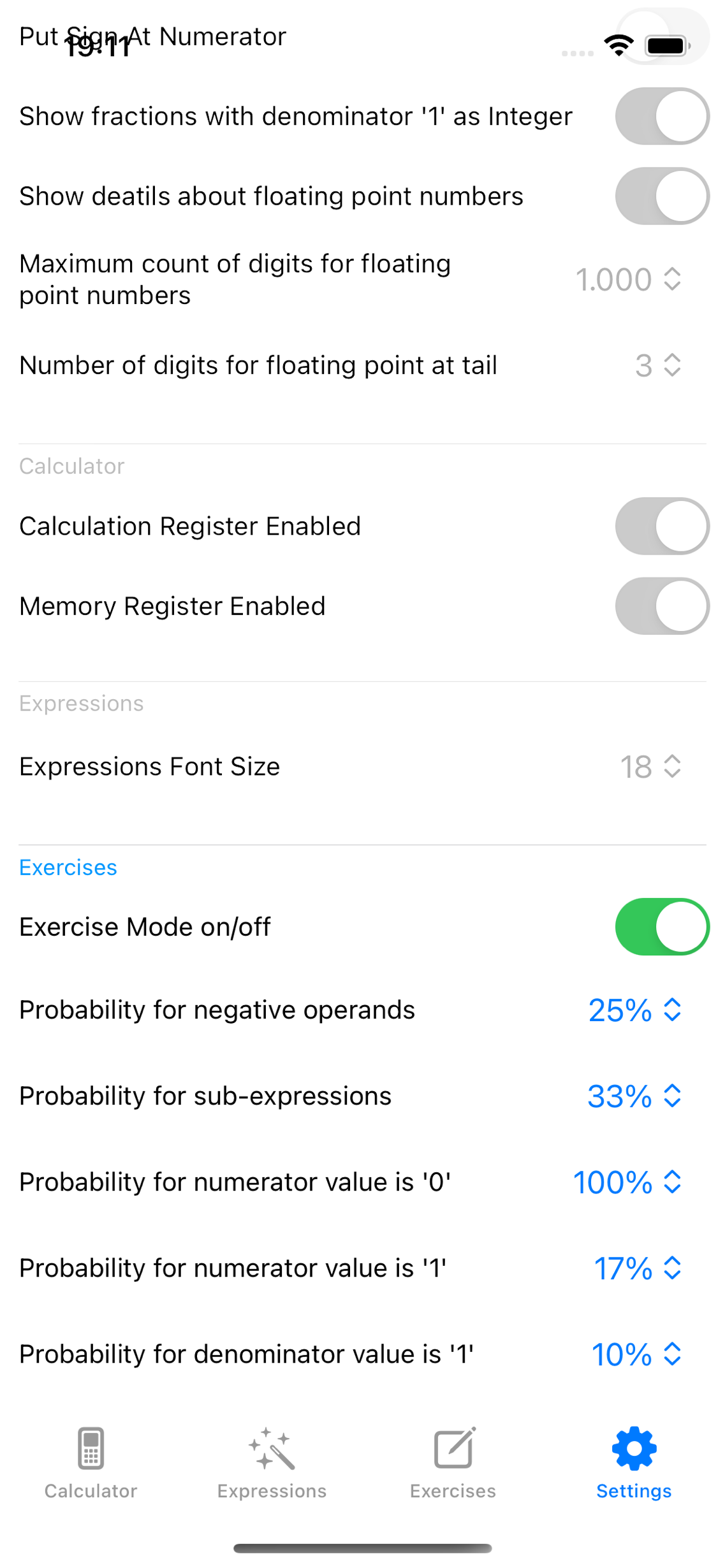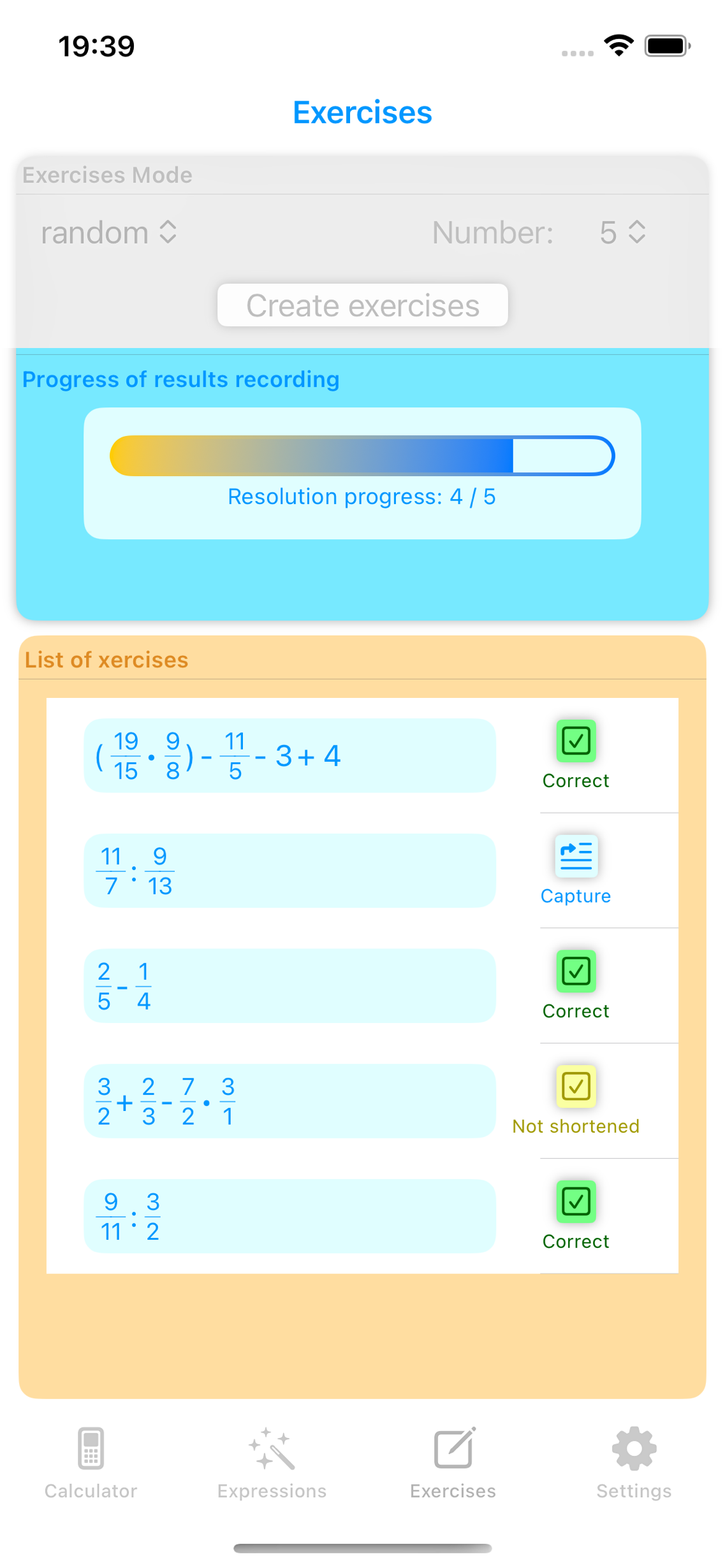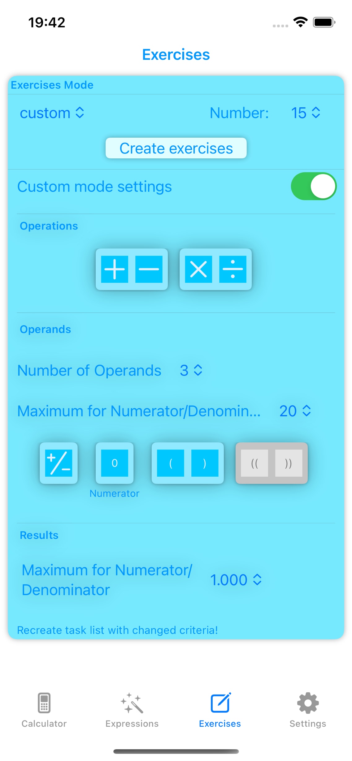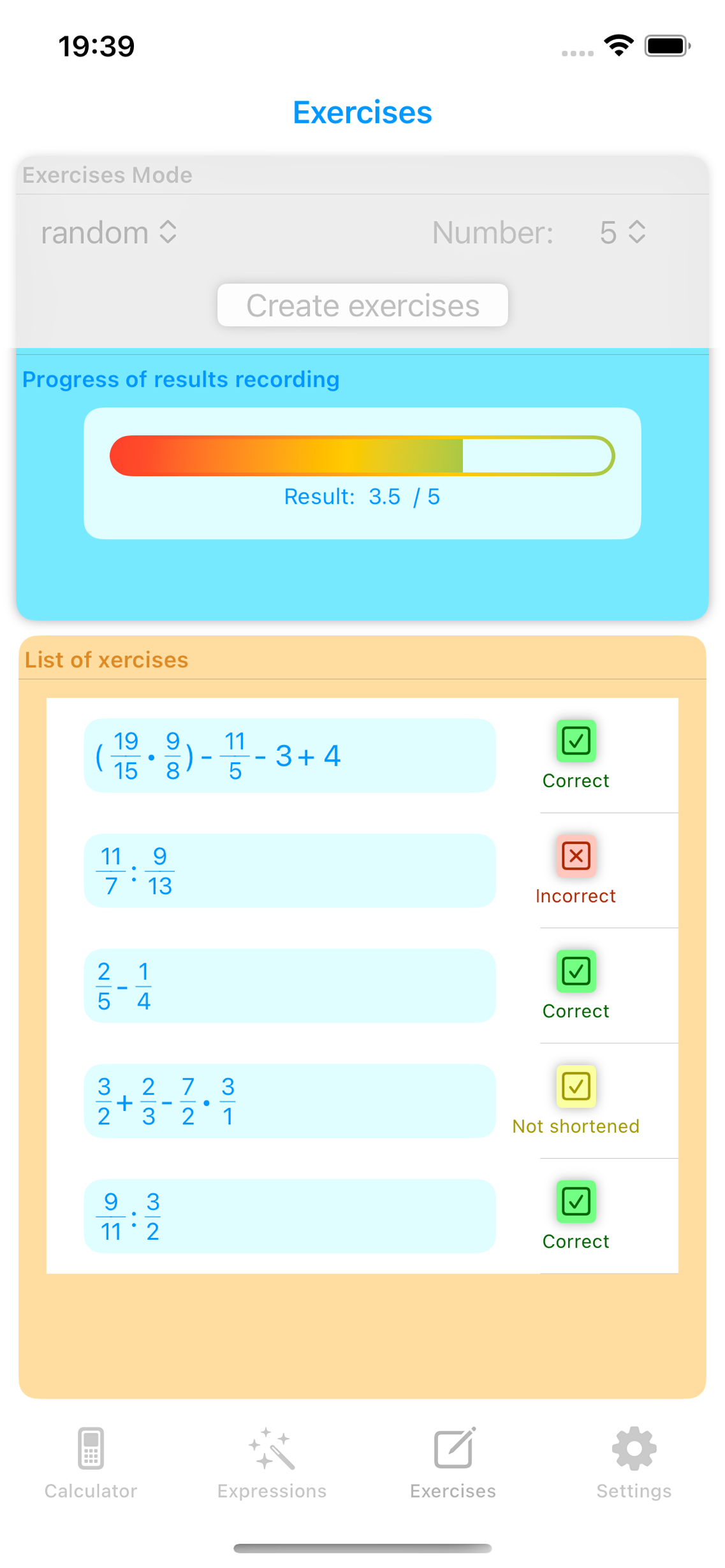 Even if the FracEx Calc app is able to calculate expressions of any nesting depth, in the Exercises mode expressions are generated with a maximum nesting depth of three sub- expressions.