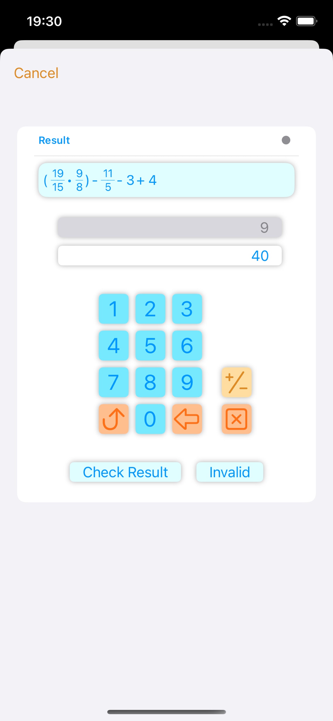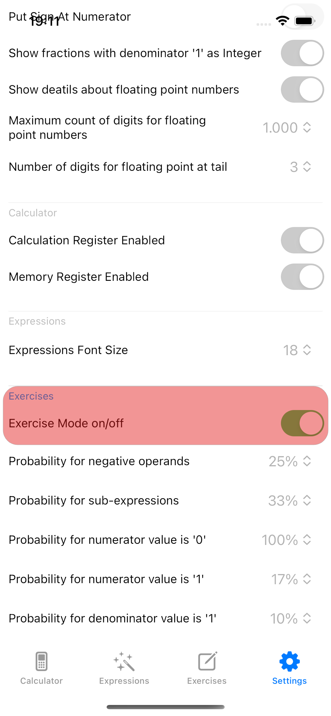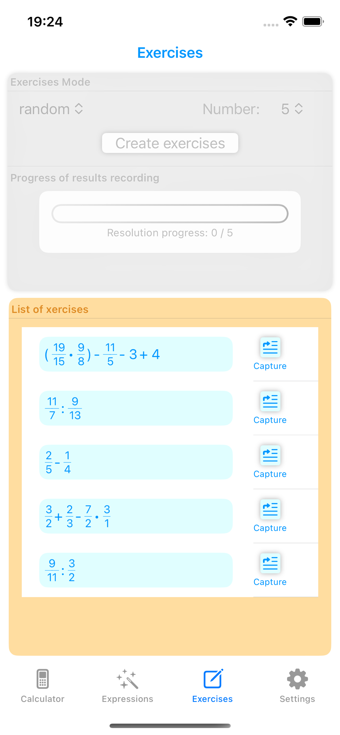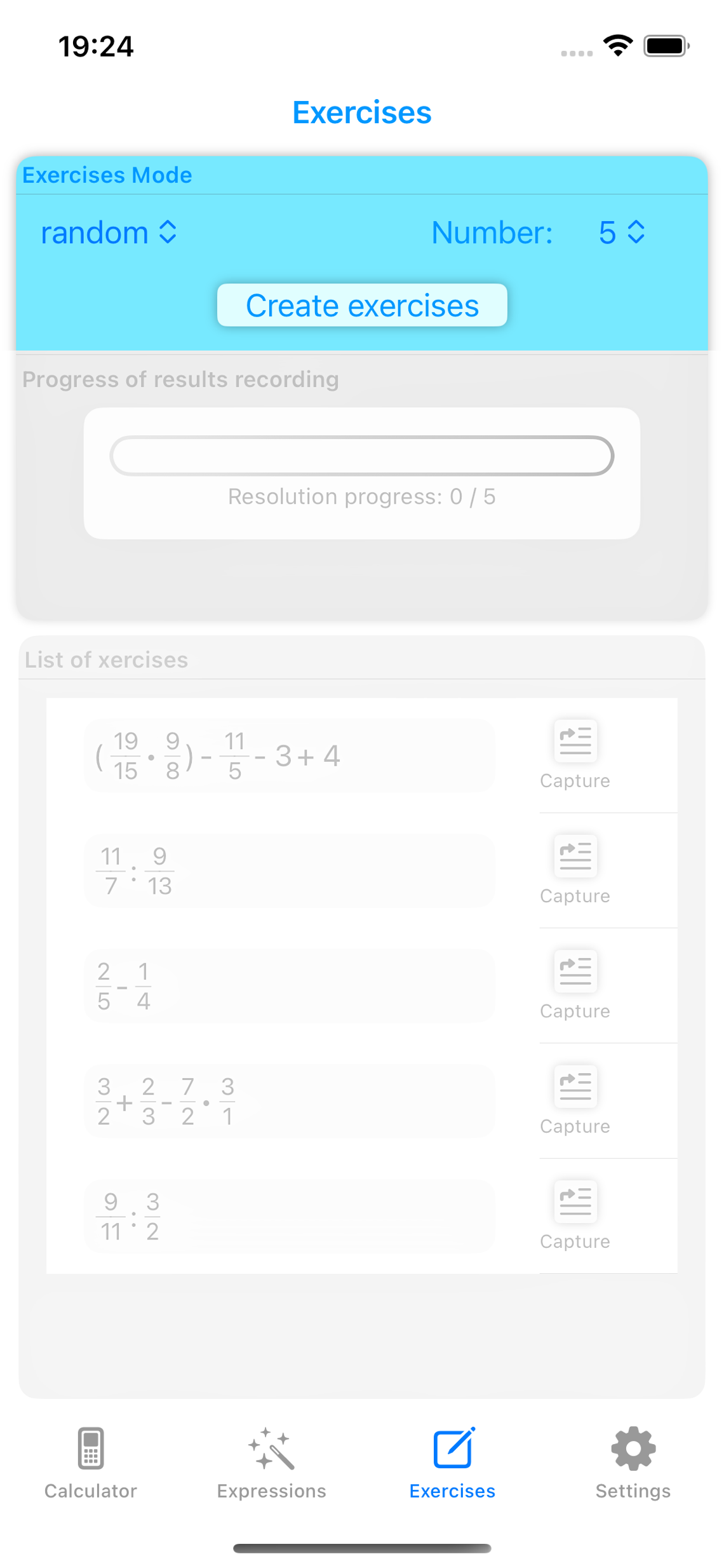 Even if the FracEx Calc app is able to calculate expressions of any nesting depth, in the Exercises mode expressions are generated with a maximum nesting depth of three sub- expressions.