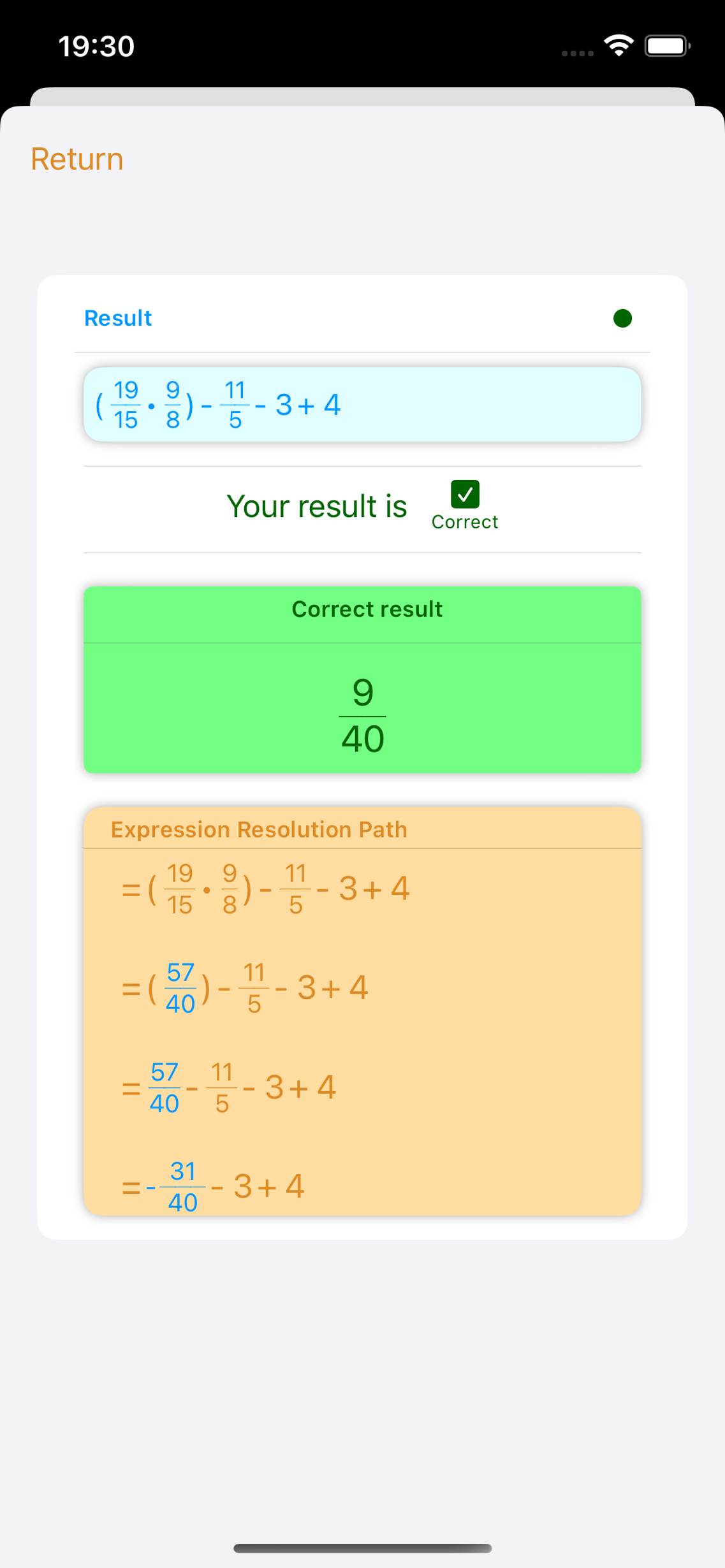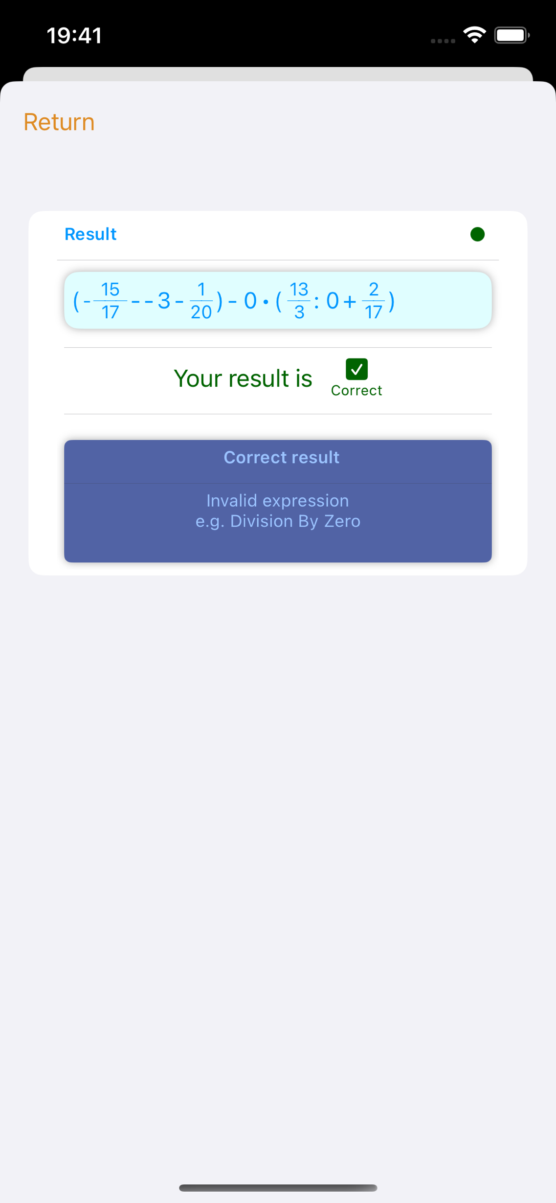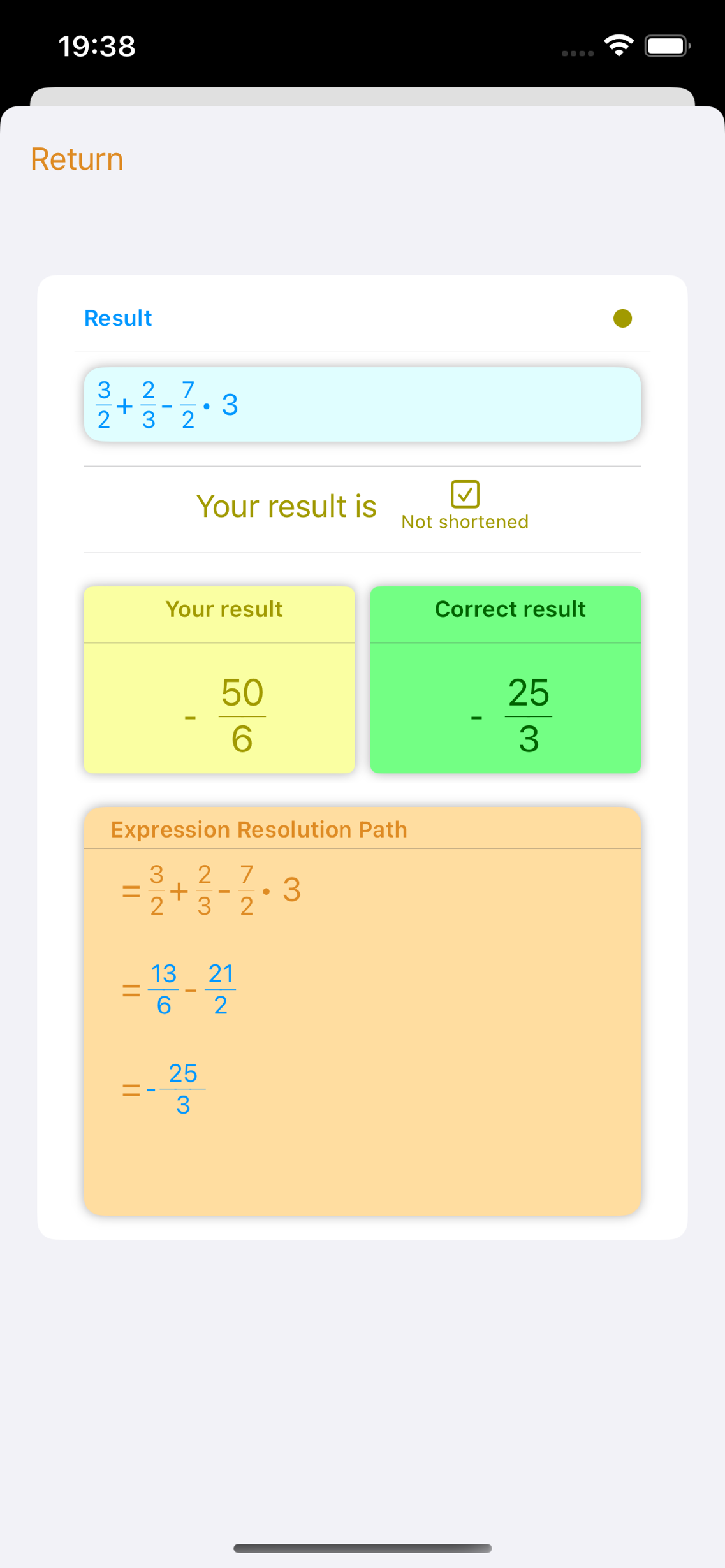 The results card first shows the exercises and the evaluation of the results - in the form of a result symbol and text as “Correct”, “Correct but not shortened” or “Incorrect”.
