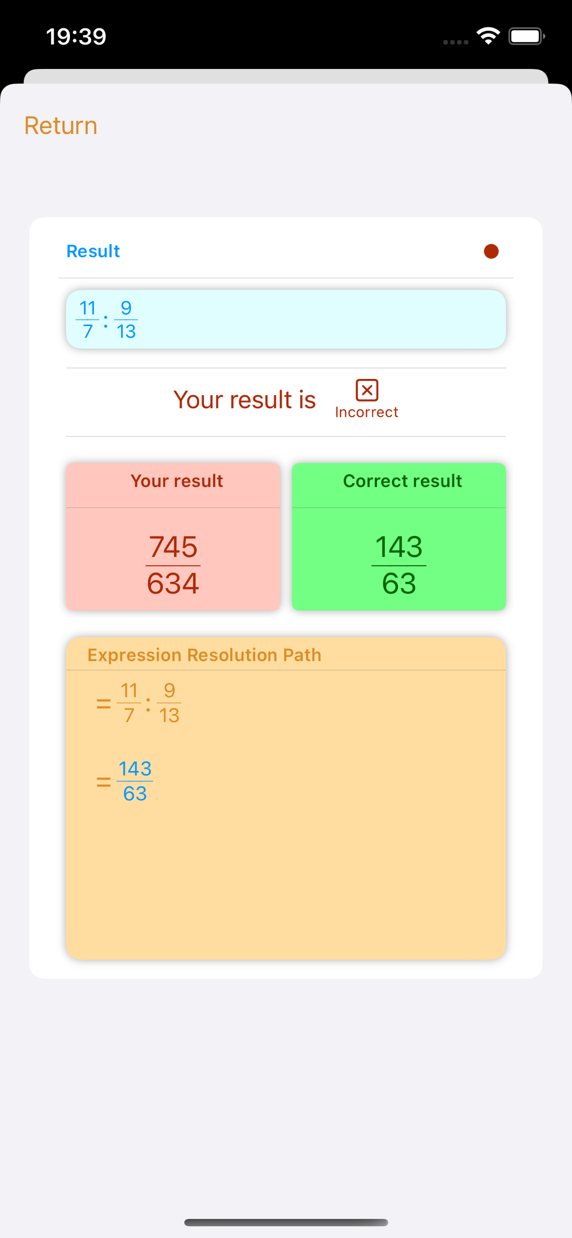 After checking the results, the entered result and, in the case of an error, the correct result are displayed:
