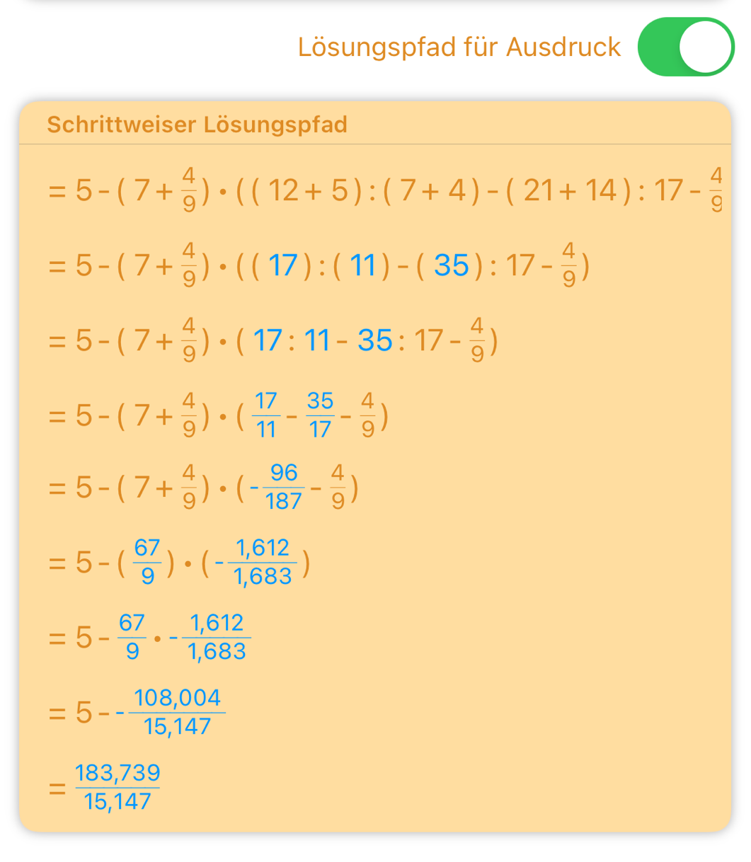 Im Ausdrücke-Modus gibt es die Option sich schrittweise die Berechnung des Rechen-Ausdrucks durch FracEx Calc anzeigen zu lassen.