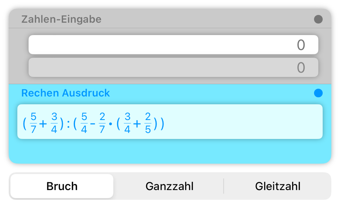 Für alle Eingabe-Modi (Bruch, Ganzzahl und Gleitzahl) im Ausdrücke-Modus’ wird auch der eingegebenen Rechen-Ausdruck auf der Zahlen-Eingabe-Karte angezeigt.