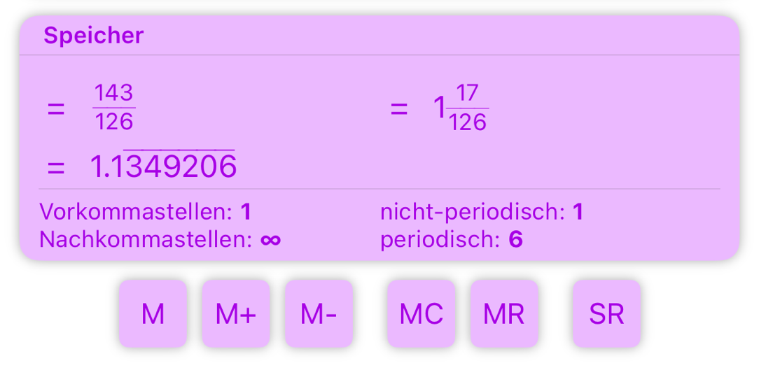Auf dem iPhone 8 / iPhone SE erfolgt im rechner-Modus die Ausgabe der Details zur Gleitzahl ausschließlich bei ausgeschaltetem Speicher-Register und nur für das Ergebnis-Register.