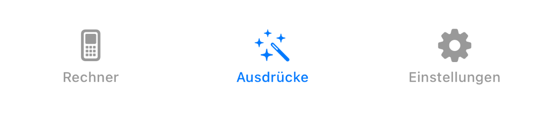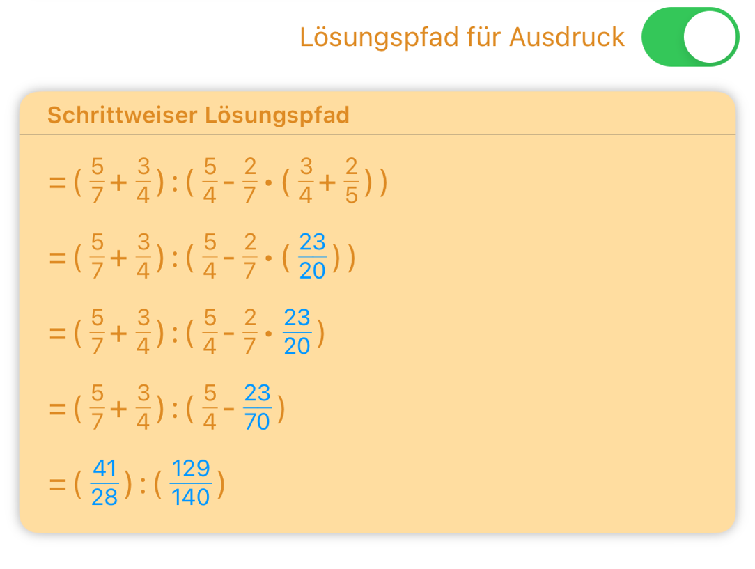 Im Ausdrücke-Modus kann mittels dem Schiebeschalter Lösungspfad für Ausdruck zwischen der Eingabe-Tastatur und der Anzeige eines möglichen Lösungsweges für die schrittweise Berechnung des Gesamtergebnisses hin und her geschaltet werden.
