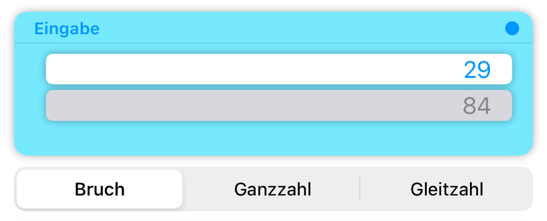Im Eingabe-Modus für Brüche werden Zähler und Nenner in der Eingabe-Karte angezeigt.