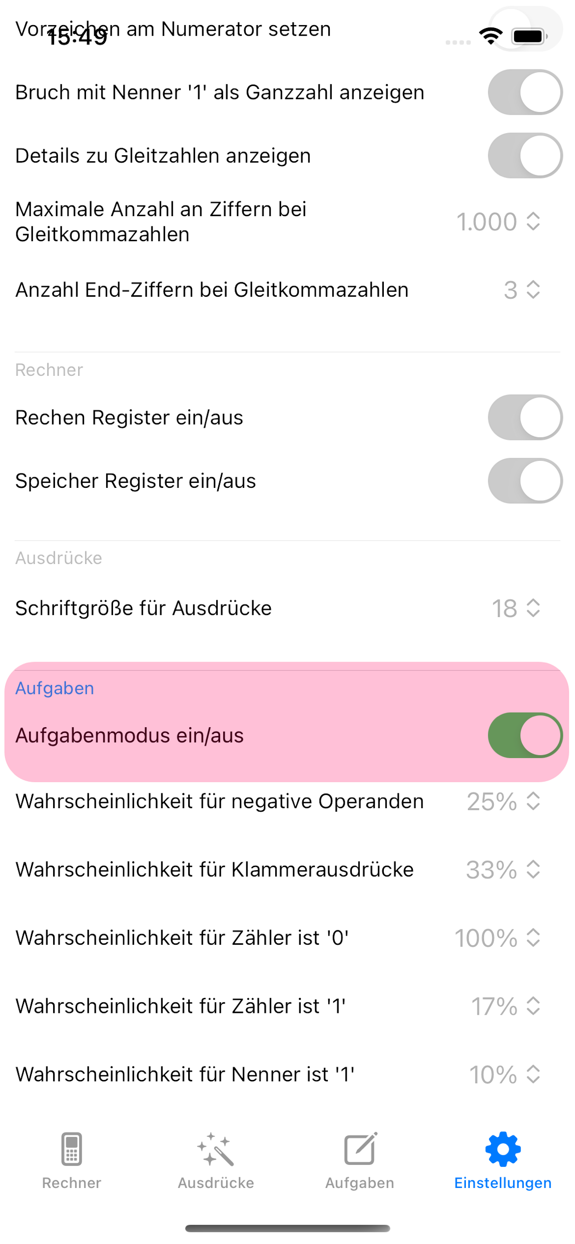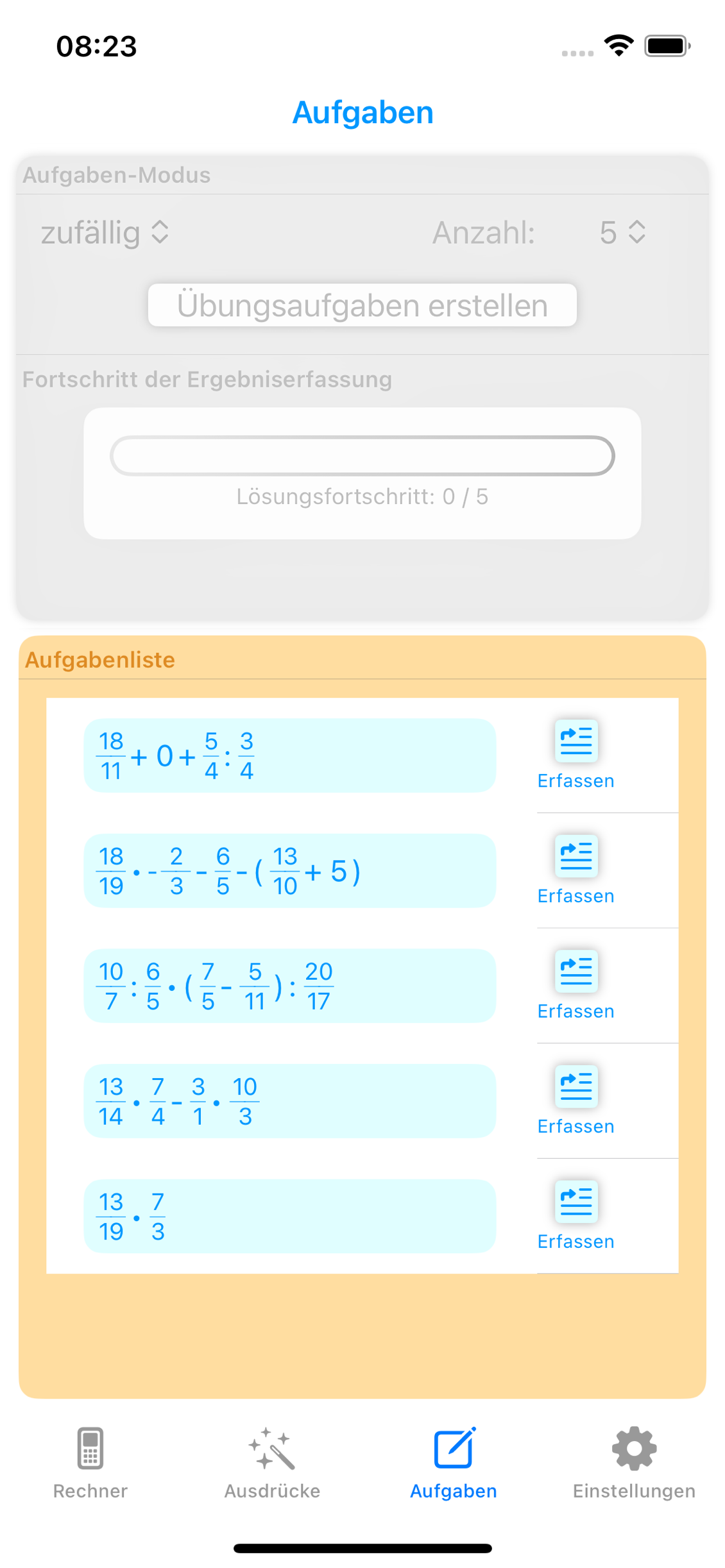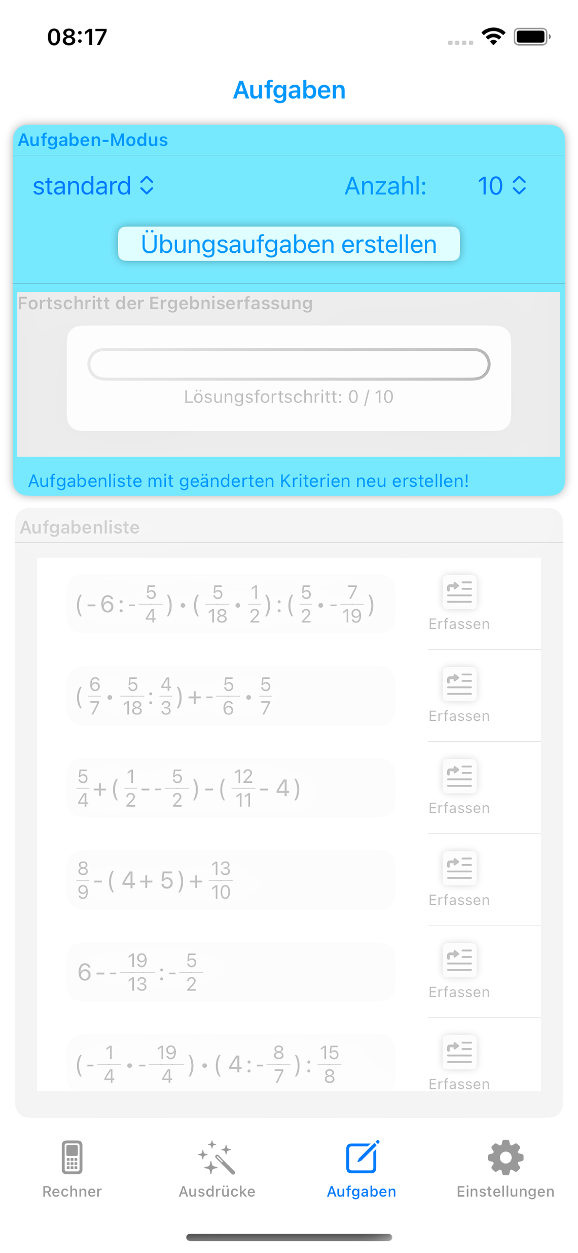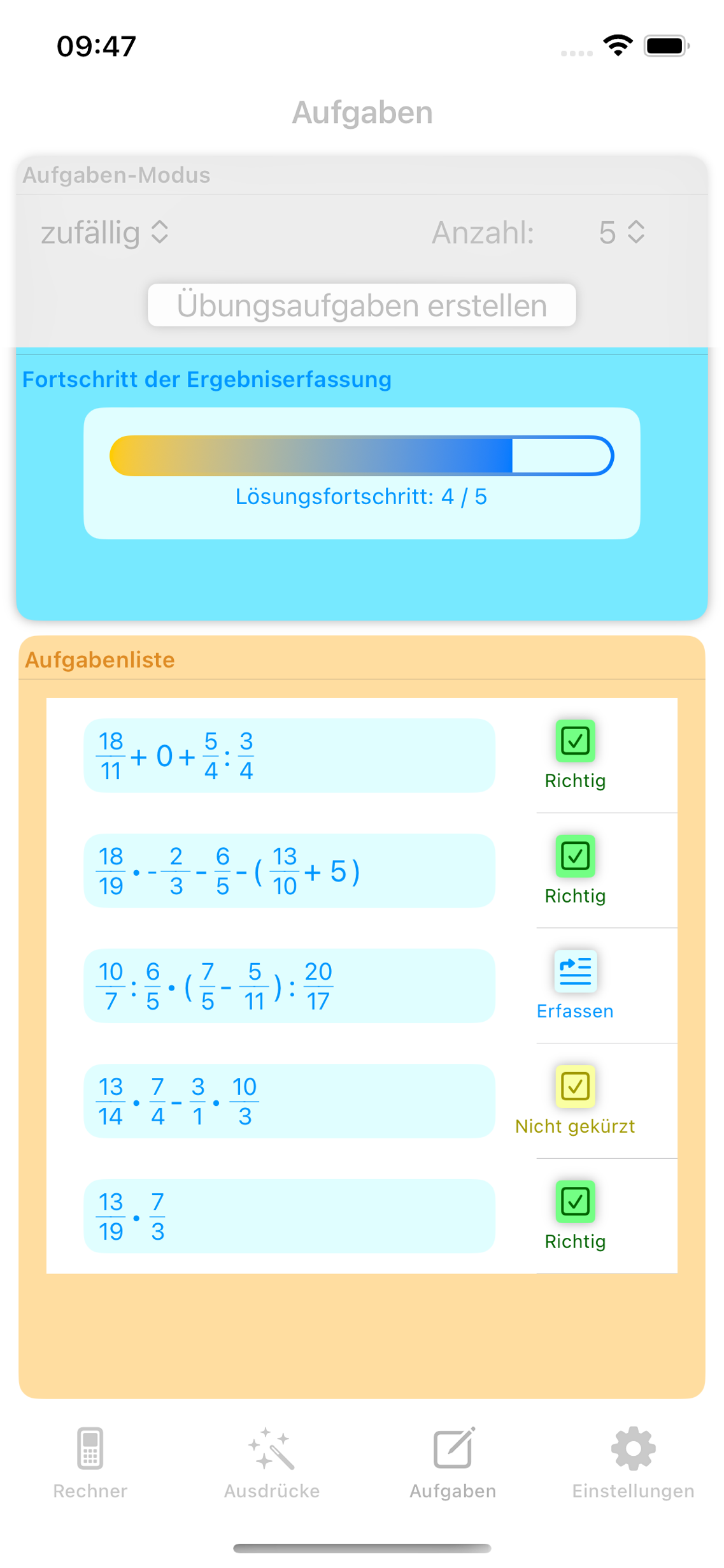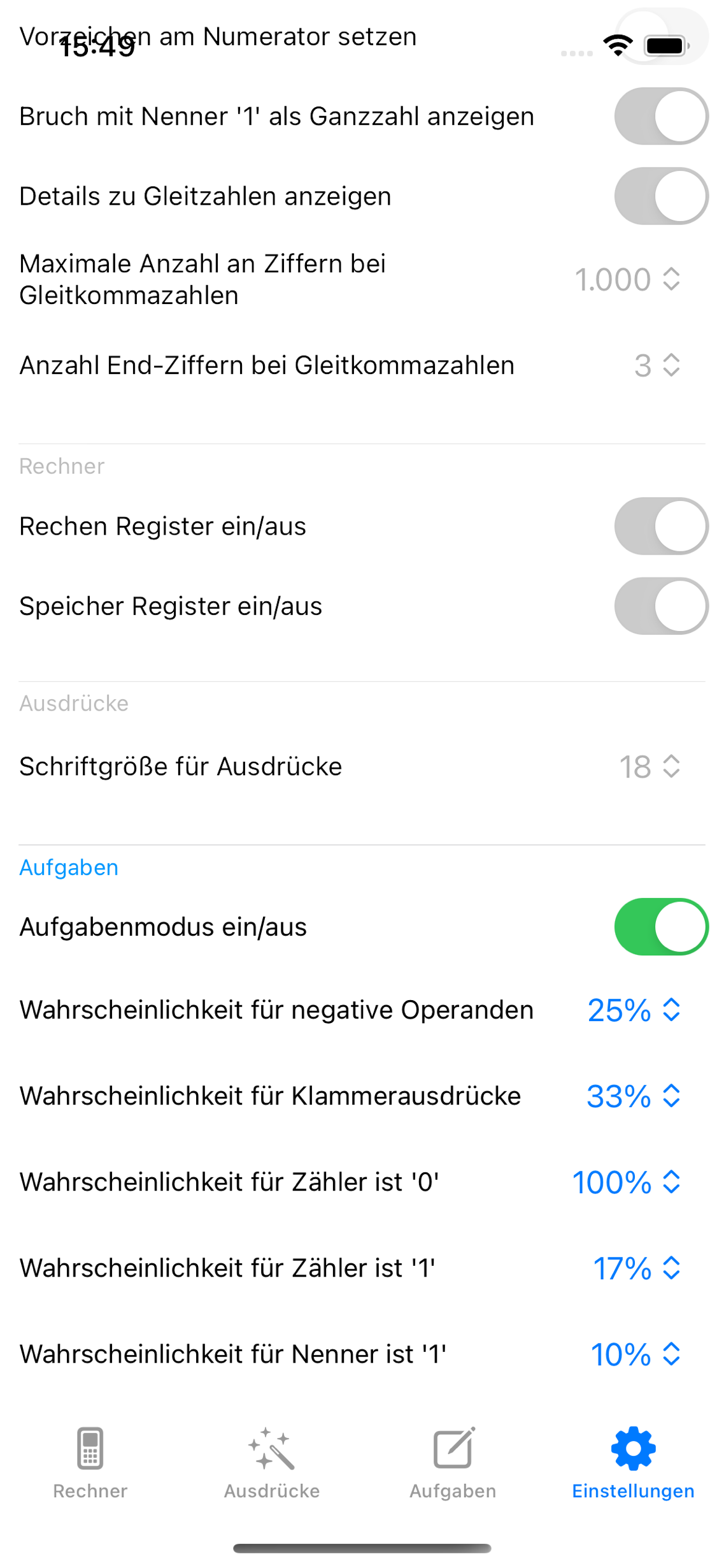 Auch wenn die FracEx Calc App Ausdrücke beliebiger Verschachtellungstiefe berechnet, im Übungsaufgaben-Modus werden Ausdrücke mit einer maximal Verschachtellungstiefe von drei Teil-/Klammer-Ausdrücken erzeugt.