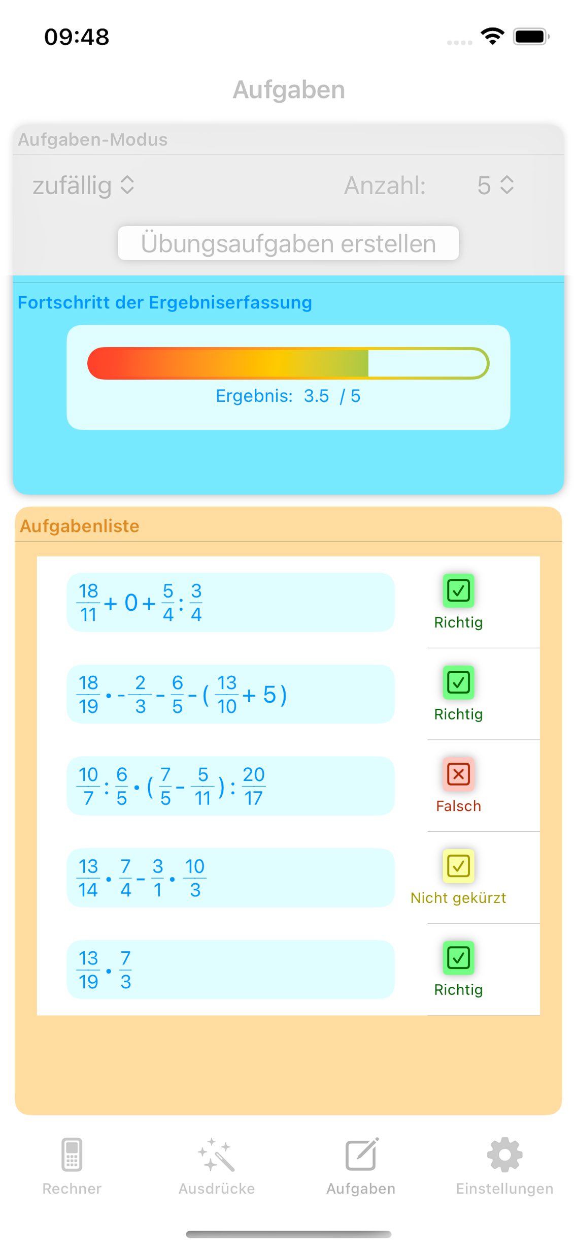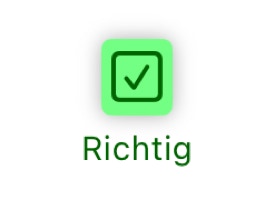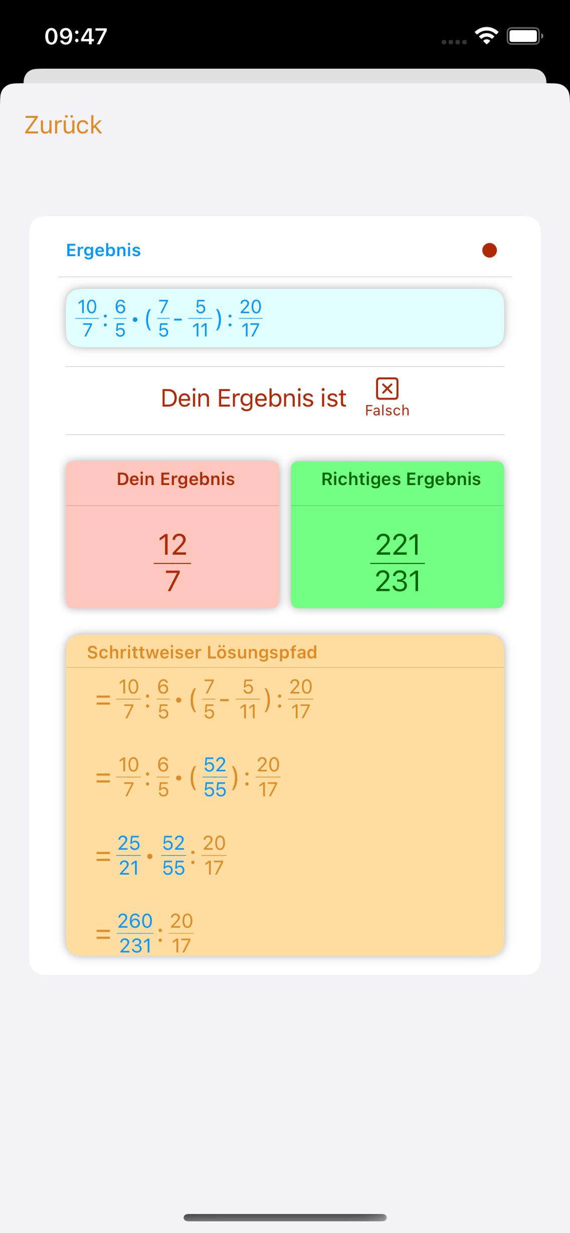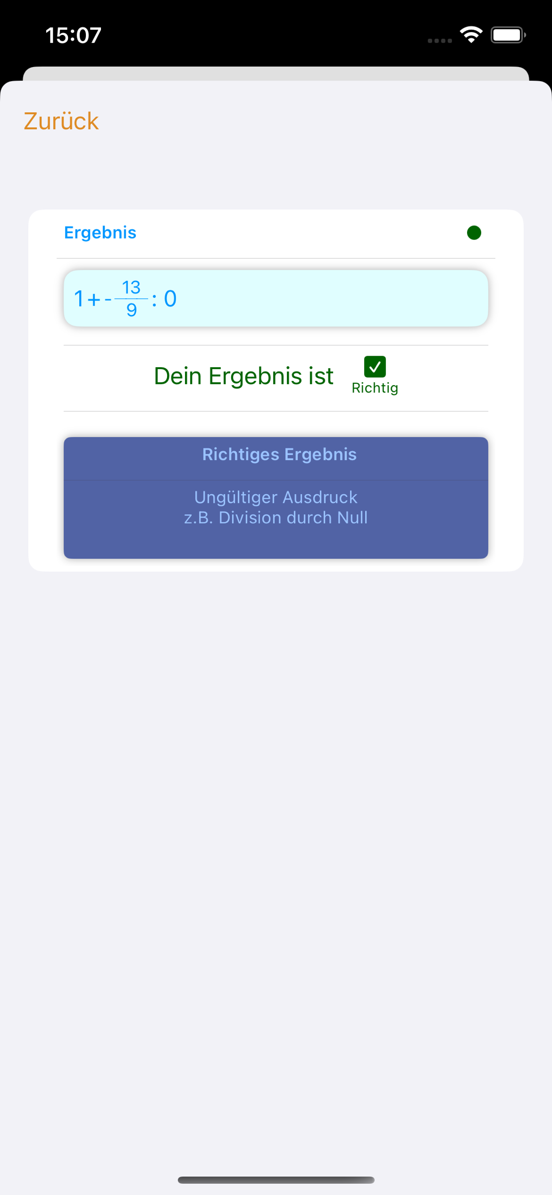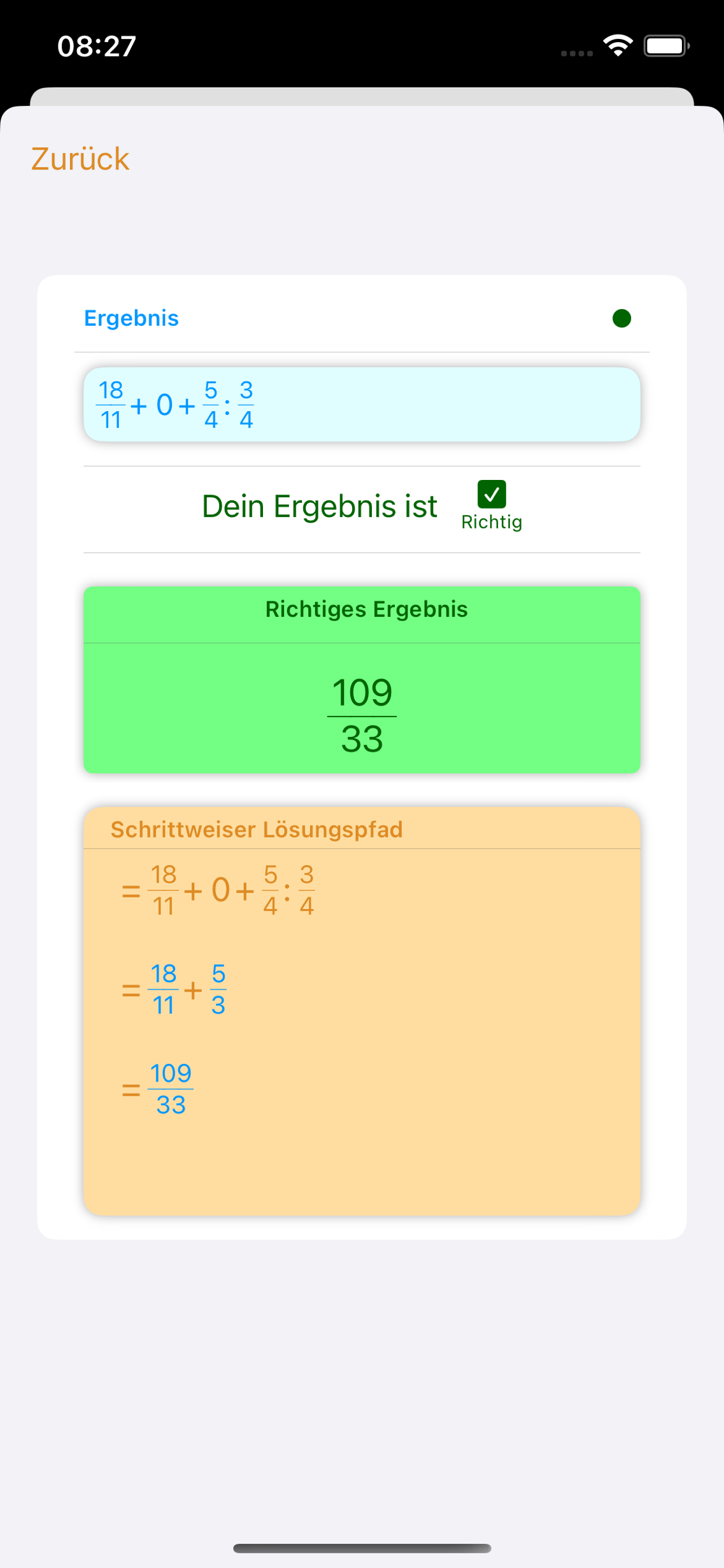 Auf der Ergebnis-Karte wird zunächst die Übungsaufgaben sowie die Ergebnisauswertung - in Form von Ergebnis-Symbol und Text als „Richtig“, „Richtig, aber nicht gekürzt“ oder „Falsch“ - angezeigt.